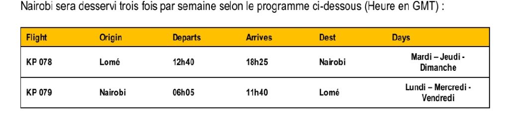Nairobi sera desservi trois fois par semaine selon le programme ci-dessous (Heure en GMT) :