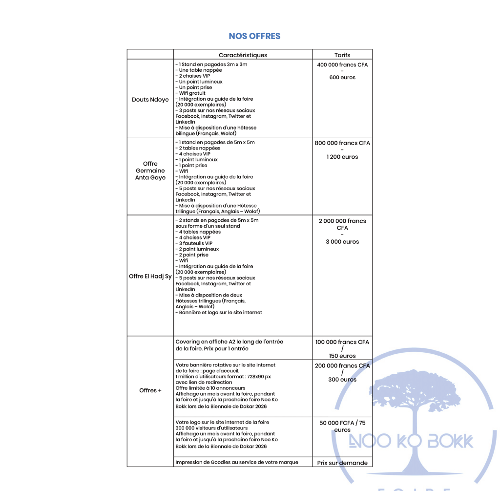 - Seules les 20 premières demandes d’admission à la Foire Noo Ko Bokk ayant payé leurs acomptes de 50% seront retenues.