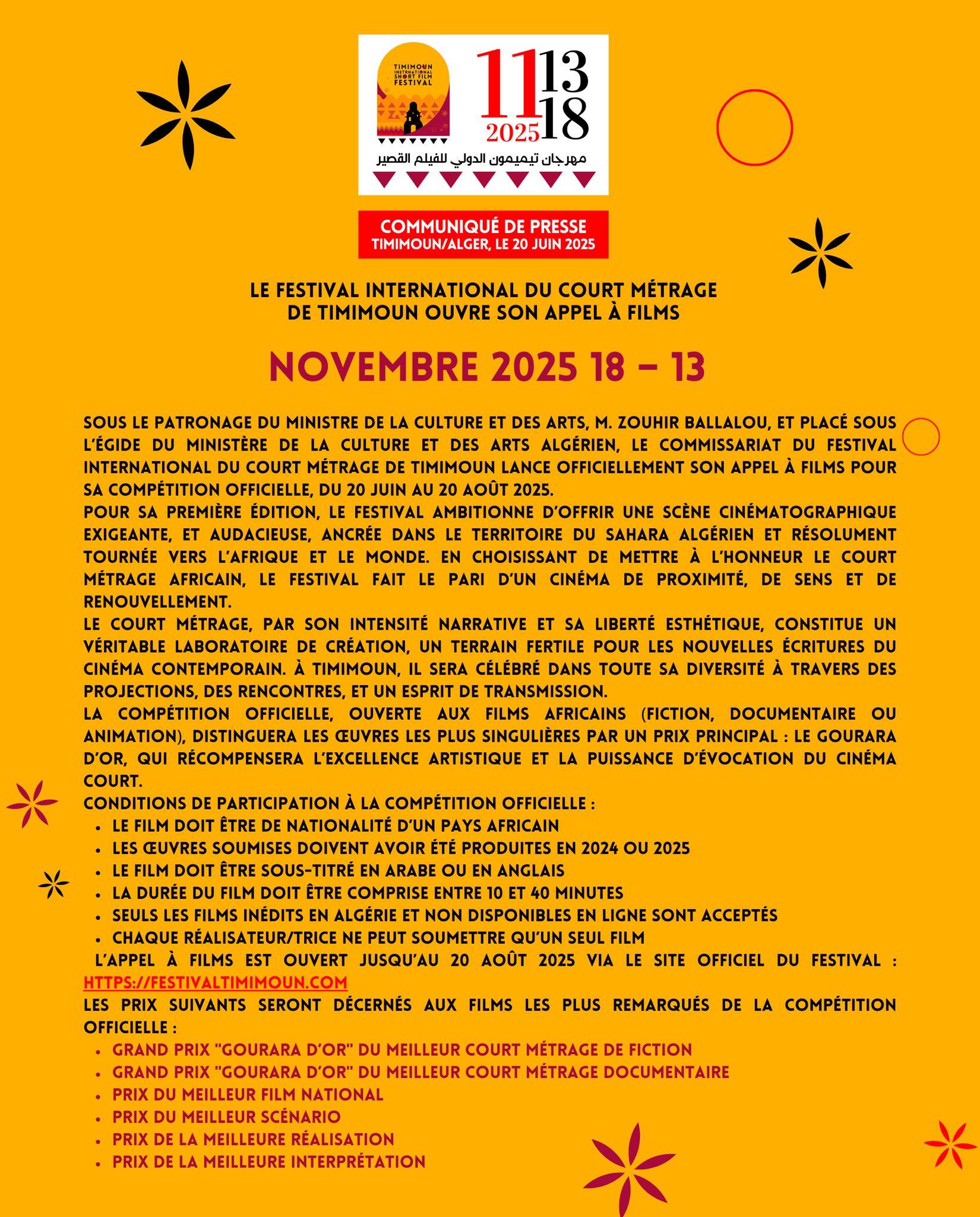 Avec cette première édition, Timimoun entend s’inscrire durablement dans la cartographie des festivals africains et porter une nouvelle voix du cinéma court sur le continent.
